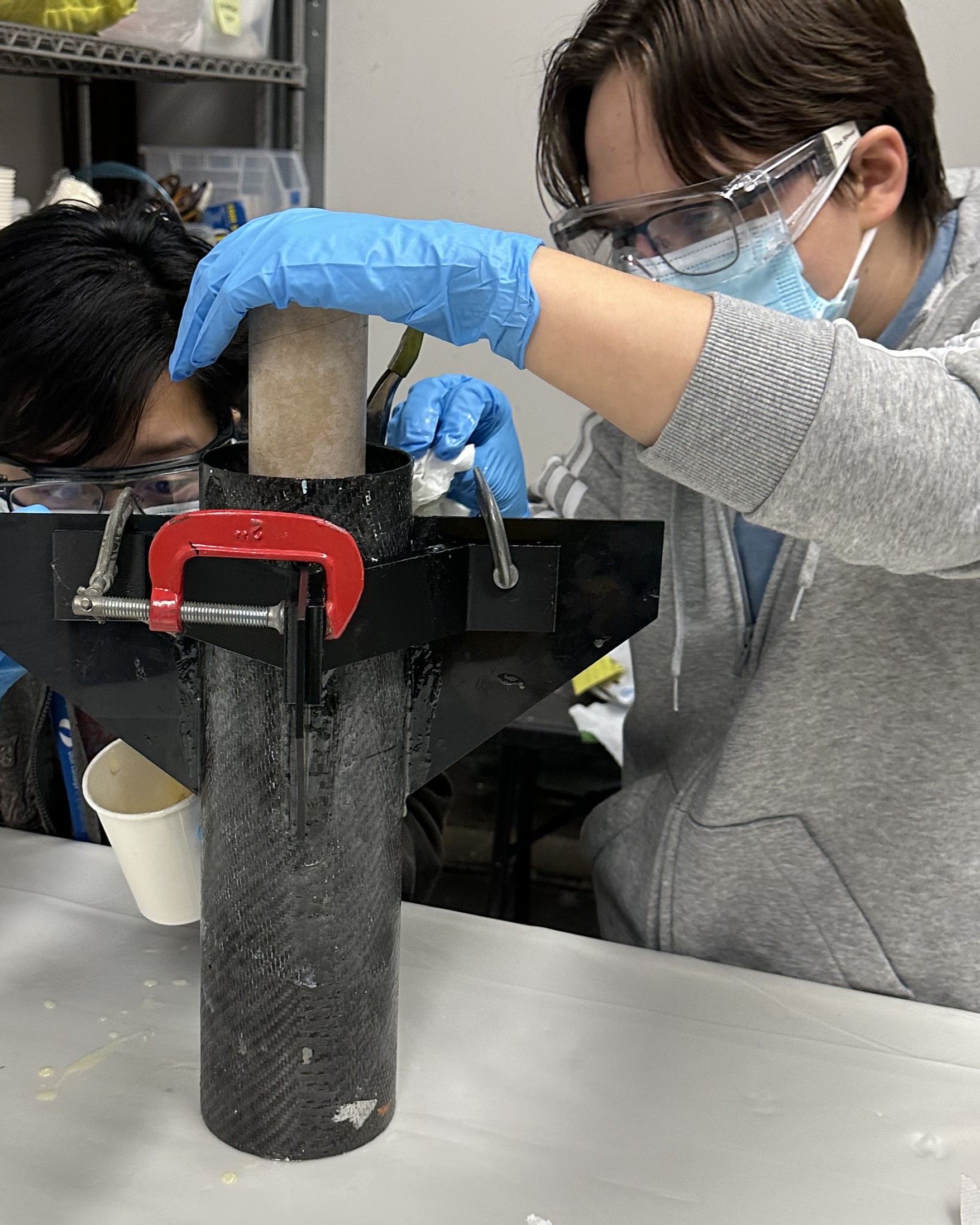 I manufactured carbon-fiber body tubes for the rocket by laying carbon fiber sheets and 2-part liquid epoxy over a mandrel. This process required precision to ensure the final body tube was a consistent diameter and had a smooth surface that was free from any defects, such as air bubbles or surface tears.